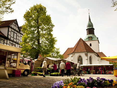 Wekelijkse markt op het kerkplein in Bad Essen - vers, regionaal, seizoensgebonden.