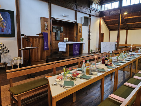 Gebaseerd op de noodkerken die in de naoorlogse periode werden gebouwd, bood deze houten kerk, geschonken door de Lutheran World Federation en in serie geproduceerd, de mogelijkheid om zowel voor kerkdiensten als voor andere gemeenschapsevenementen te worden gebruikt. De altaarnis is af te sluiten met dubbele deuren, typische kerkramen ontbreken. Tegenwoordig worden de originele meubels aangevuld met moderne kunstwerken.